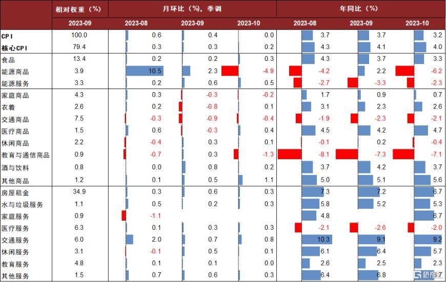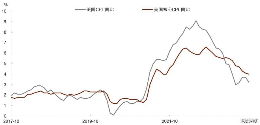 美国10月CPI同比3.2%,核心CPI同比4.0%,低于市场和我们的预期。尽管医疗保险价格因统计口径原因反弹,但汽油、房租、二手车、酒店等价格增速疲软使得整体通胀仍得以回落。短期来看,通胀放缓意味着美联储进一步加息的必要性下降,美国经济软着陆的希望上升,投资者风险偏好改善,前期调整较多的资产有望反弹(请参考报告《海外宏观变化带来交易窗口期》)。但我们也提示,不宜对美国货币宽松有过度期待,我们的基准情形是美联储在明年上半年保持现有的利率水平,下半年转向降息,首次降息或在明年9月。
