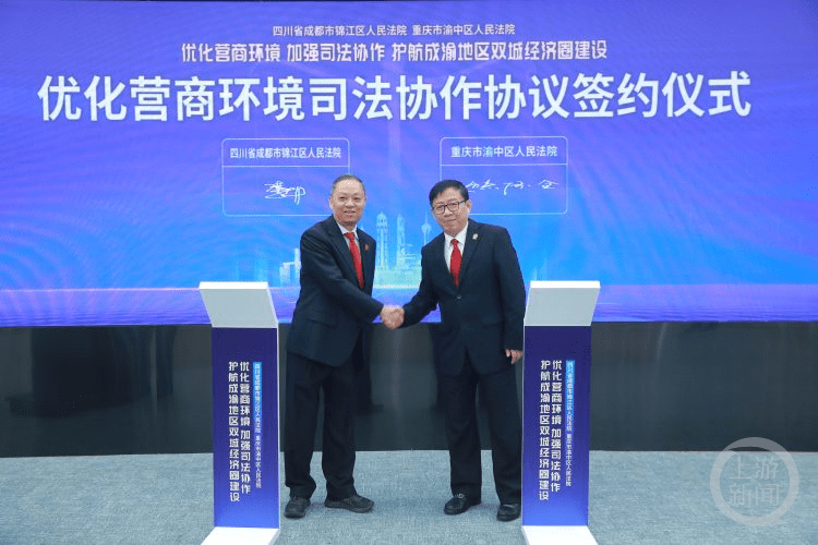 成渝地区双城又联动了!11月15日,四川省成都市锦江区法院与重庆市渝中区法院一起,在渝中区法院共同签署优化营商环境司法协作协议。