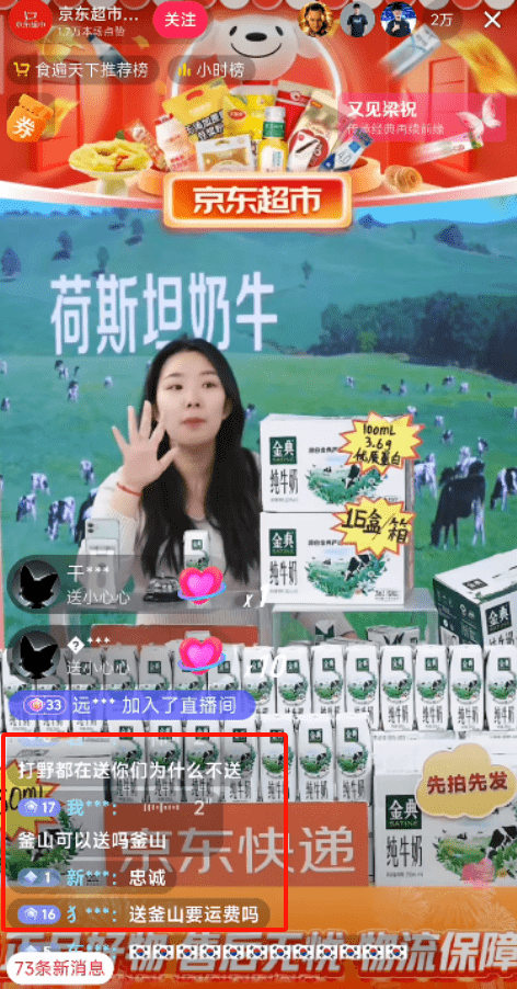 京东汽车直播间卖轮胎时,网友们在刷“灵车专用”;京东超市直播间里,网友们又刷“打野在送你不送?”;京东超市直播间,网友们在问“釜山可以送吗釜山?”