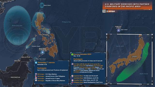 还有一点需要知道的是,美军正在西太平洋地区同时进行两场军事演习,除了美日菲韩四国在南海和菲律宾周边海域的“海上战士合作”演习外,还在菲律宾海和日本外海举行2023年度演习(AnnualEx-2023)。这个演习从11月10日一直持续到20日,美国、日本、澳大利亚、加拿大和菲律宾的二十多艘舰艇参加,由美国卡尔文森号航母打击群与日本海自日向号直升机母舰领衔。