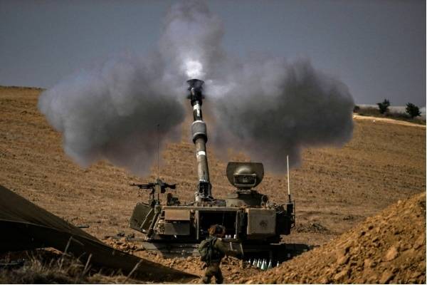 10月28日,以色列军队使用155毫米M109系列自行榴弹炮向加沙地带发射炮弹 图自彭博社配图