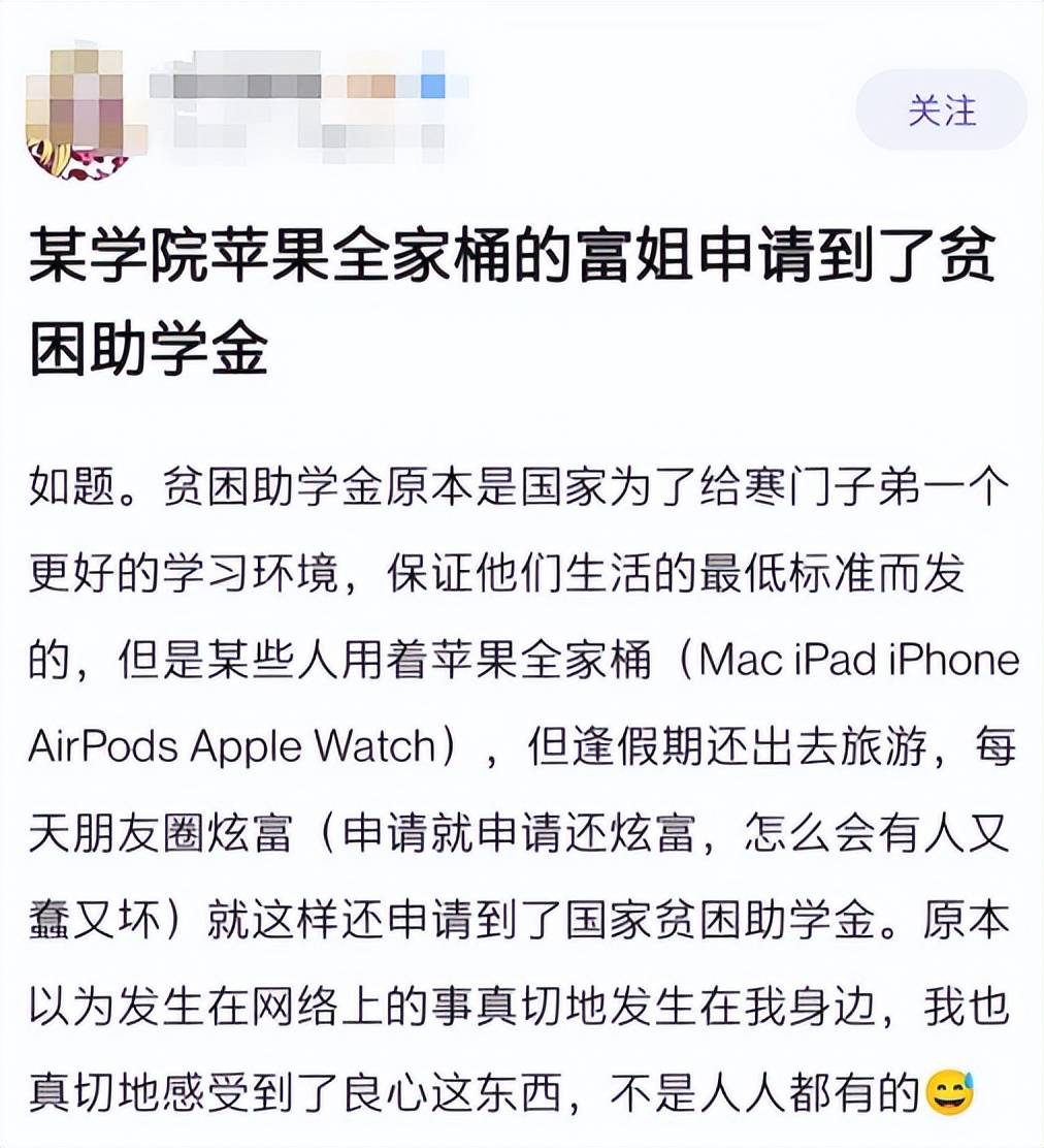 写在最后:每个学生的家庭条件不同,消费水平与经济状况也是截然不同的,当身边有真正困难且有需要的学生,那助学金谁该拿,谁不该拿,那也是一目了然的事情!