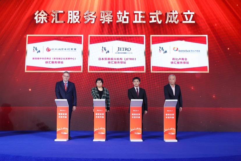 今年,徐汇“出海”开启全球推介,先后在新加坡、q中国香港以及德国、日本举办推介大会,期间得到了当地商会机构的大力支持和帮助。为延续和巩固海外推介成果,本次签约大会上,徐汇区与新加坡中华总商会(新加坡企业中心)、日本贸易振兴机构(JETRO)、荷比卢商会共同揭牌设立服务于双方企业的“徐汇服务驿站”,以此推动深化双方经贸关系往来,进一步构建“引进来”“走出去”双向合作平台。