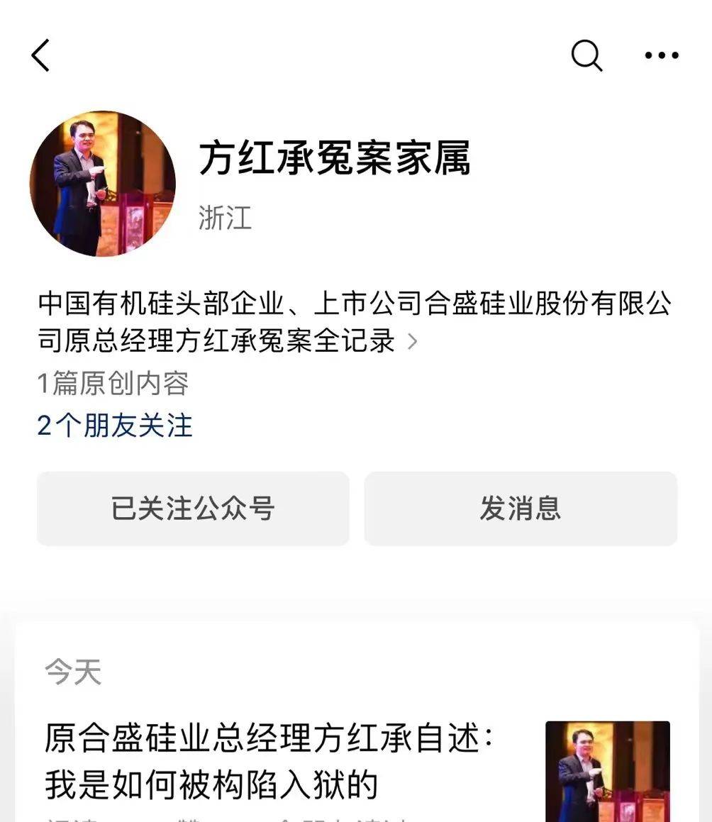 合盛硅业公告称,方红承涉嫌非国家工作人员受贿罪、职务侵占罪;而方红承家属称方红承是被“构陷入狱”。