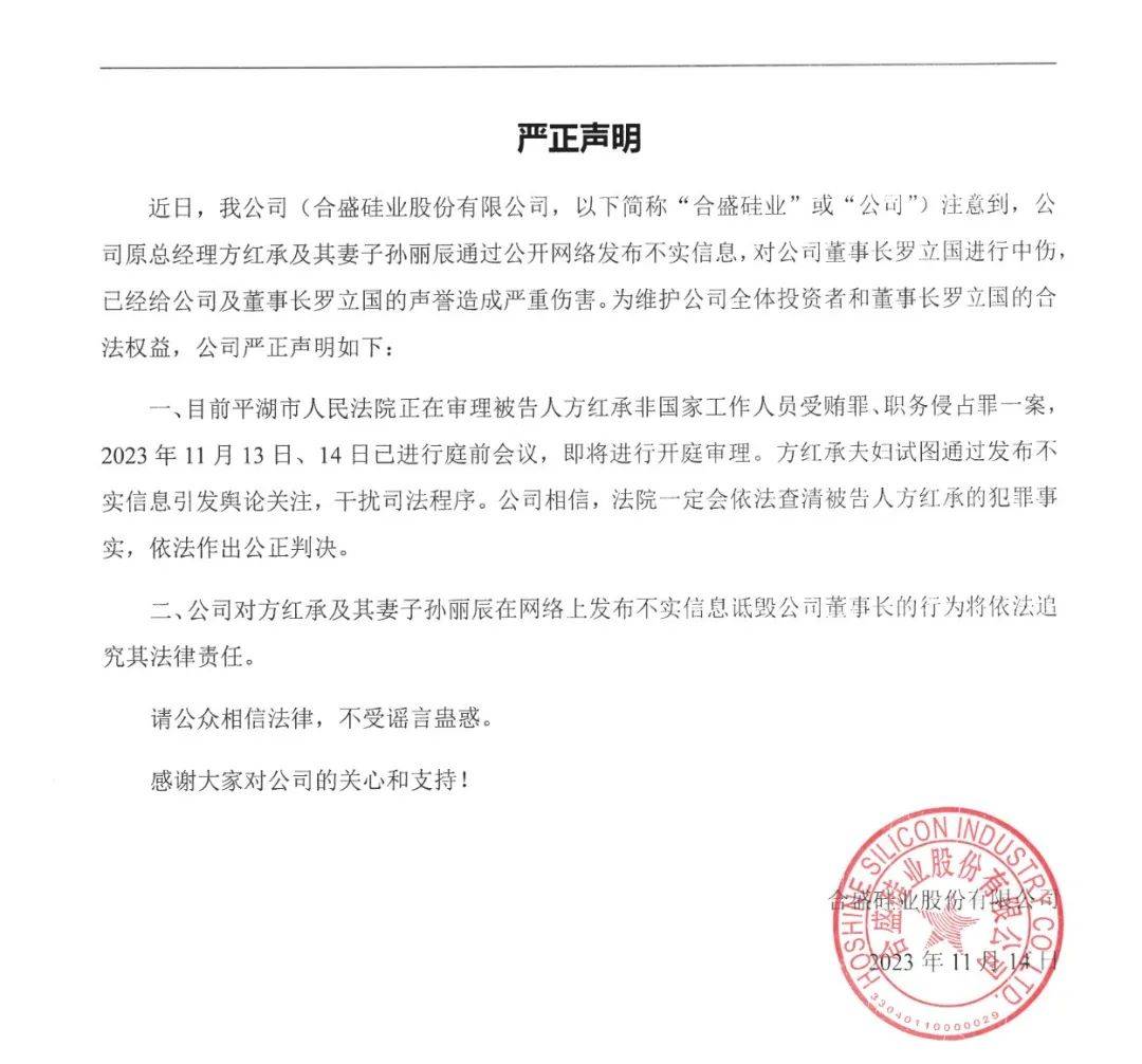 11月14日,合盛硅业通过官方微信公众号发布声明称,目前平湖市人民法院正在审理被告人方红承非国家工作人员受贿罪、职务侵占罪一案。