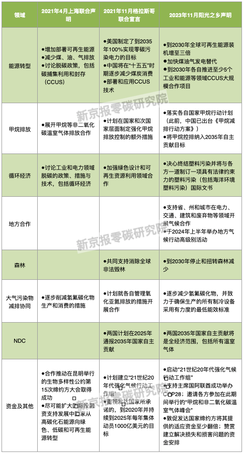 比如,提出了明确的可再生能源部署目标,两国支持到2030年全球可再生能源装机增至三倍;启动“21世纪20年代强化气候行动工作组”,开展对话与合作,并突出两国地方气候合作的重要性;提出了明确的甲烷减/控排计划和目标,将甲烷控排纳入2035年自主贡献目标;并鼓励2035年全经济范围国家自主贡献涵盖所有温室气体。