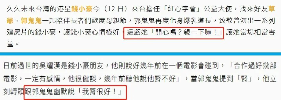 “油腻大叔”钱小豪似乎很喜欢谈这类话题,半年前他在某活动上,不仅对26岁女网红郭鬼鬼说“亲一下嘛”,还假装开玩笑地说“我肾很好”。
