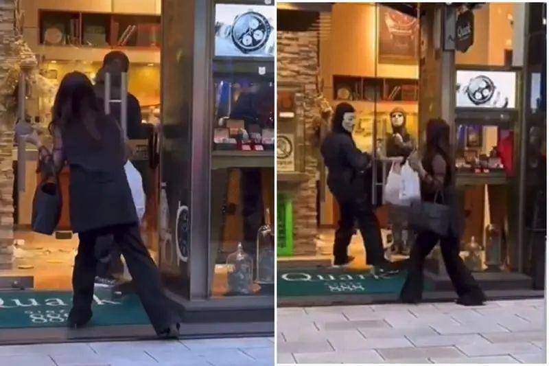 抢金店的黑衣面具男。周围人甚至不知道发生了什么,给坏人开门