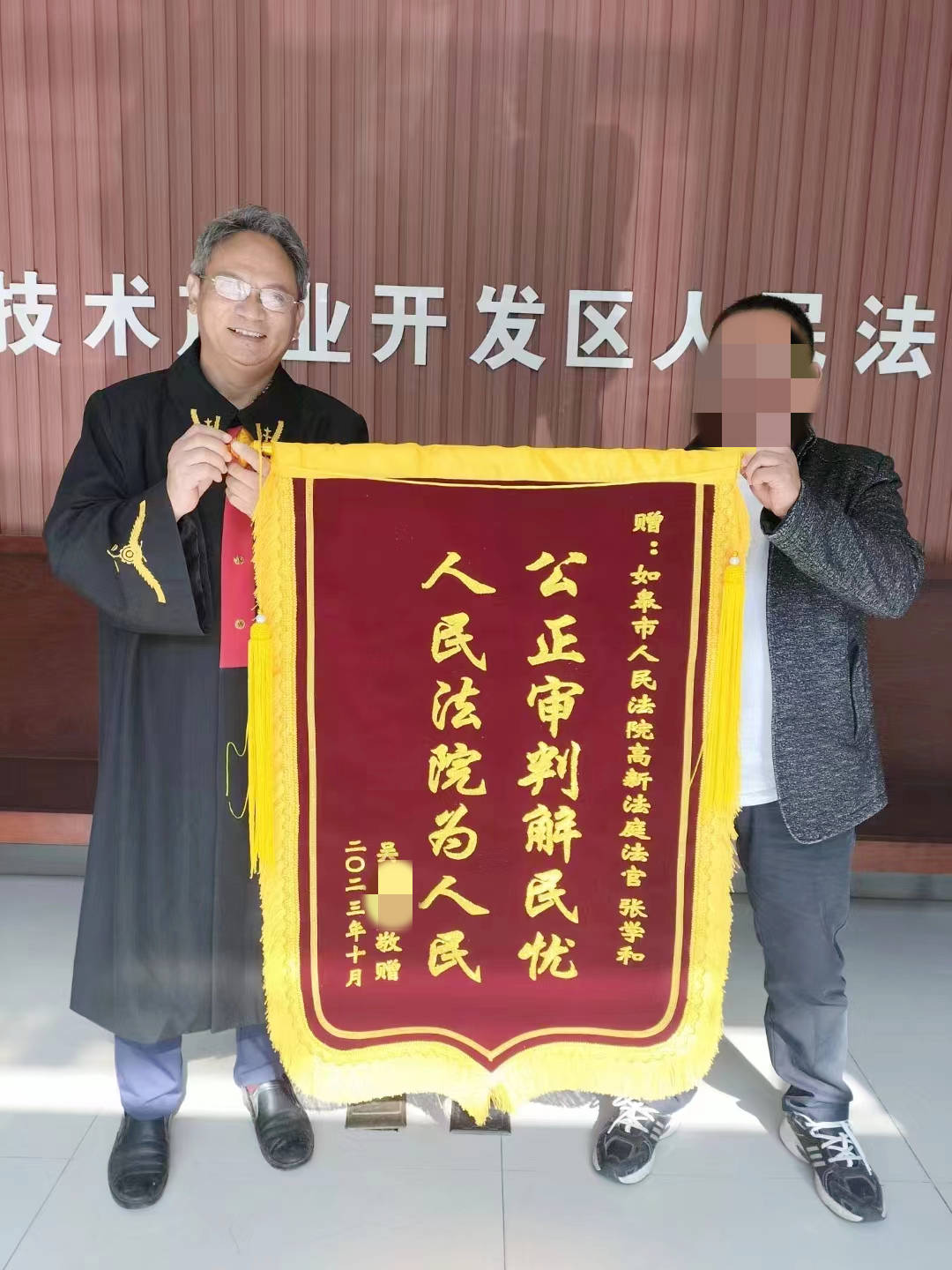 “张法官,我这案子涉及的钱不多,但是一趟趟地真是麻烦你了,我来没有别的意思,就是想谢谢你!”当事人吴某一大早便来到如皋法院高新区法庭,将一面印有“公正审判解民忧,人民法院为人民”的锦旗送到张学和法官手中。