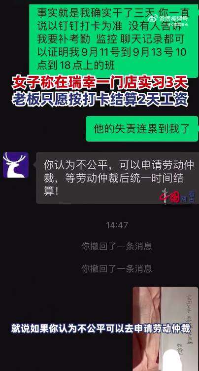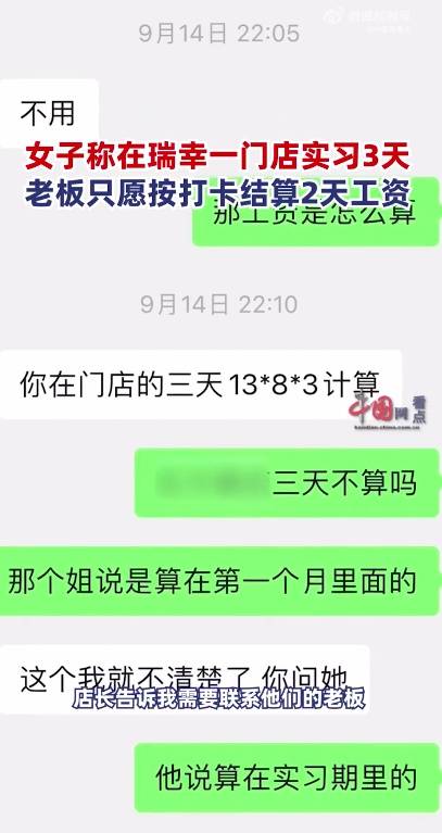 据中国网看点报道,11月15日,江苏徐州一女子称,2个月前在瑞幸一门店实习3天,结工资时老板却只愿按打卡记录发2天的工资。