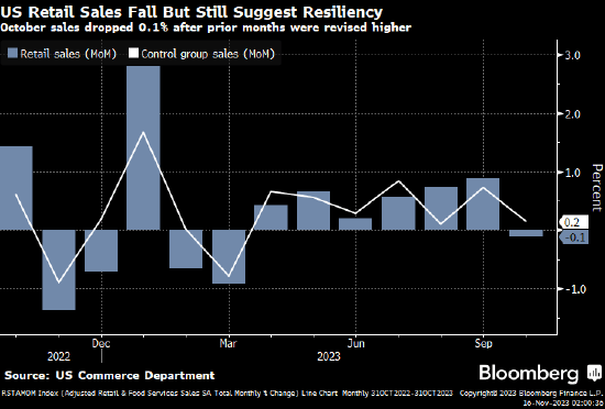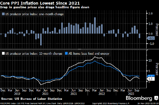 美国10月份零售销售总额下降0.1%,低于预期,此前两个月的数据均被上修。美国另一份官方数据显示生产者价格指数(PPI)上个月意外下降0.5%,降幅为2020年4月以来最大,这得益于汽油价格暴跌。