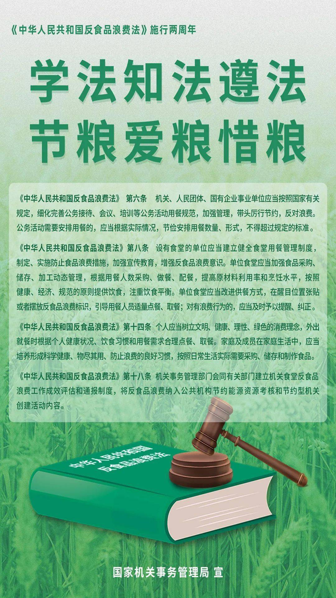 反食品浪费法共32条,分别对食品浪费的定义、反食品浪费的原则和要求、政府及部门职责、各类主体责任、激励和约束措施、法律责任等作出规定。强调国家厉行节约,反对浪费;明确各级人民政府和国务院有关主管部门的职责任务,规范公务用餐、餐饮服务经营者等食品经营者的行为,引导个人和家庭树立正确消费理念;构建政府领导、部门协作、行业引导、媒体监督、公众参与的反食品浪费社会共治机制;科学设定法律责任,以刚性的制度约束,严格的制度执行,坚决制止浪费行为。