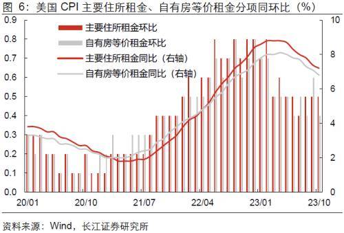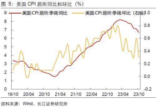 10 月美国核心服务环比涨幅大幅回落至0.3%,主因租金涨价压力下降以及酒店价格季节性回落,带动居所CPI环比涨幅缩小至0.3%,居所分项对CPI环比拉动率较上月减少0.11个百分点至0.1个百分点。