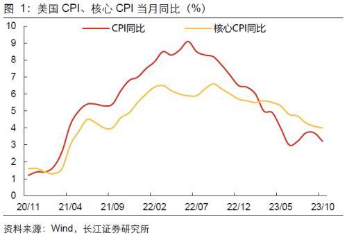 2023 年11月14日,美国劳工统计局公布2023年10月份的CPI数据:美国10月CPI同比增加3.2%, 前值3.7%,市场预期3.3%;核心CPI同比增加4%, 前值4.1%,市场预期4.1%。