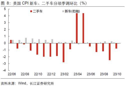 美国商品需求仍然偏弱,10月美国核心商品CPI环比跌幅收窄至0.1%。10 月二手车价格环比降幅由上月的2.5%收窄至0.8%,但新车价格环比由涨转跌,较上月下降0.1%,合计拉动CPI环比下降0.02个百分点,是核心商品CPI通缩的主要贡献项。整体来看,美国商品需求仍然低迷,商品通胀压力不大。