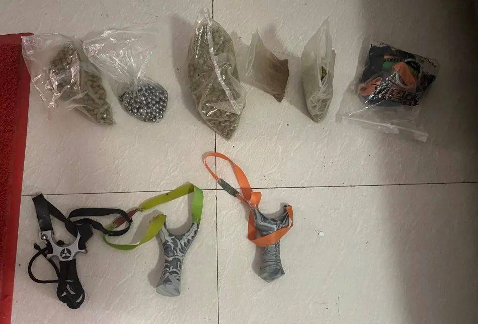 民警通过现场勘验、询问受害人、走访周围群众以及分析研判,发现该小区隔壁栋楼的一住户有重大嫌疑。10月17日,民警通过排查,在该小区隔壁楼栋2楼住宅内将嫌疑人李某抓获,在其卧室弱电箱内查获弹弓3把、配件5副、钢珠500余克、高硬度泥丸1400余克。