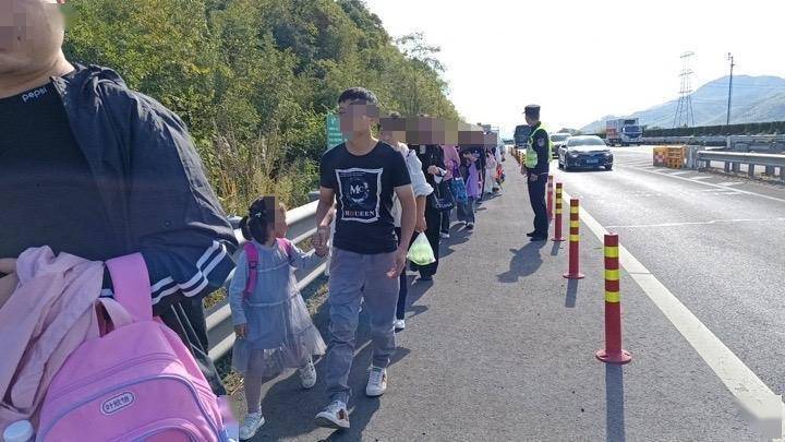 移动过程中,民警一路陪同并指挥大家保持队形以及注意后方来车,同时安排辅警驾驶警车跟随大部队,在后方亮灯预警,提醒后方来车注意避让。最终,顺利帮助滞留游客安全转运至百丈收费站。