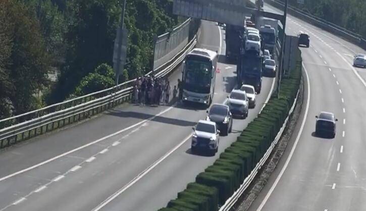 11月10日,杭州公安高速交警支队四大队接到报警:在S14杭长(宜)高速长兴方向32公里700米处,有一辆大客车打着双闪灯停在第二车道,车上人员陆续下了车,在硬路肩上走动,情况十分危险。