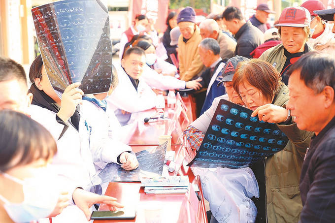 昨日,海安市人民医院组织专家团队走进开发区上湖村、堑南村,开展大型义诊活动,为群众提供量血压、测血糖等免费诊疗服务。濮端建 摄 (视觉江苏网供图)