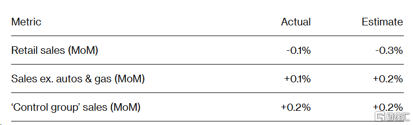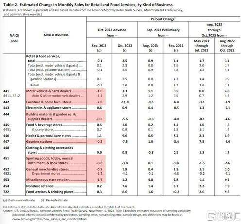 具体来看,剔除汽车及零部件经销商、加油站数据后的零售销售额环比增长0.1%。同时,将9月的数值上修至增长0.9%。分类别看,13个零售销售额类别中有7个类别环比下滑:汽车及零部件经销商环比下滑1%;家具和家居店销售额下降2%;杂项商店零售商销售额下降1.7%;加油站销售额下降0.3%。