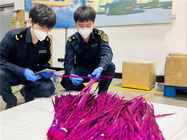 图说:浦东机场海关查获涉濒危白冠长尾雉羽毛700克 陈弘博 摄
