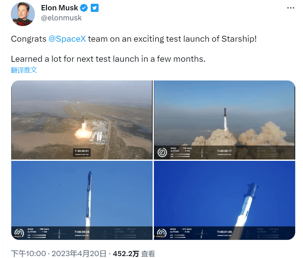尽管4月20日的发射未能成功,但马斯克仍第一时间发推文回应:“祝贺SpaceX团队对星舰进行了激动人心的测试发射!为几个月后的下一次测试发射学到了很多东西。”