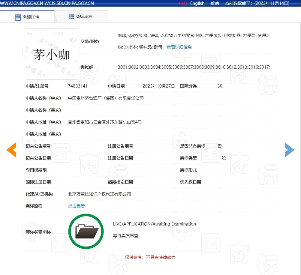 上证报中国证券网讯 11月14日,记者从中国商标网获悉,中国贵州茅台酒厂(集团)有限责任公司于10月27日申请注册“茅小咖”商标(申请/注册号为74833141),国际分类为方便食品,当前商标状态为等待实质审查。