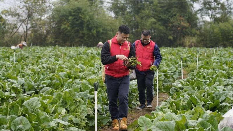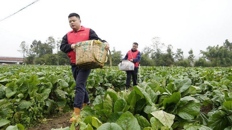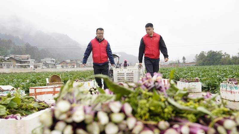 11月15日,在贵州省黔南布依族苗族自治州龙里县湾滩河镇园区村红菜苔基地,志愿者走进田间地头,帮助群众一起采收、打包、装箱红菜苔。