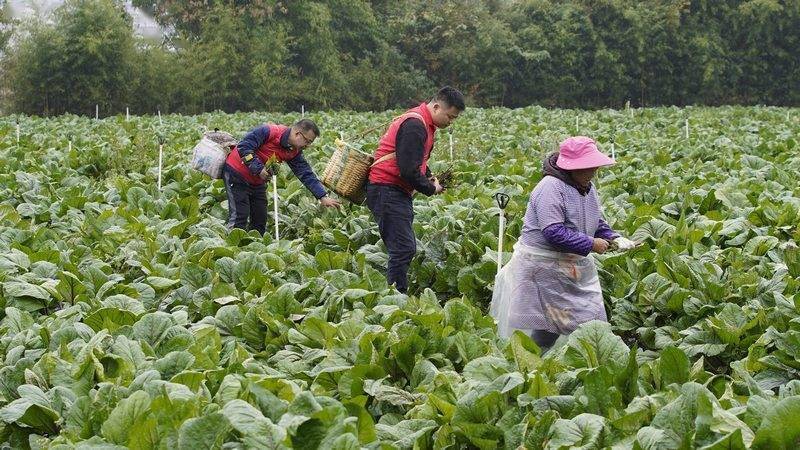 11月15日,贵州省黔南布依族苗族自治州龙里县湾滩河镇园区村红菜苔基地迎来第七茬采收,志愿者走进田间地头,帮助群众一起采收、打包、装箱红菜苔。