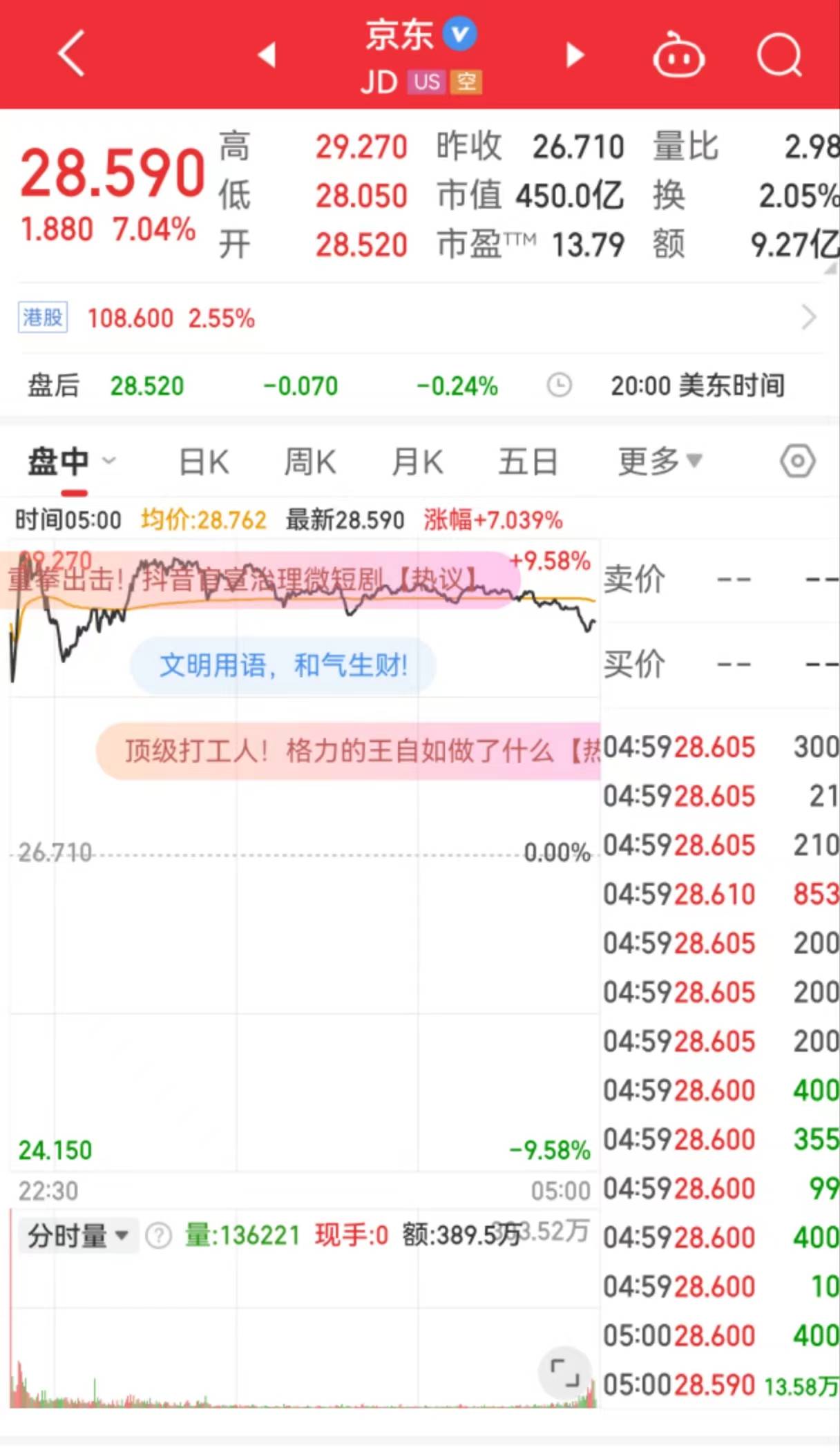 截至11月15日收盘,京东股价大涨7.04%,每股报收28.59美元,总市值一夜之间增加29.59亿美元(约合人民币214亿元)至449.98亿美元。