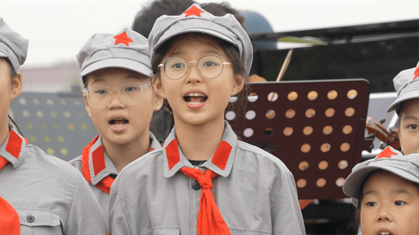 小龙浚和全校学生们一起登上了舞台,在乐团的伴奏下放声歌唱。晚风中,童声宛如天籁,赢得围观村民的阵阵掌声。