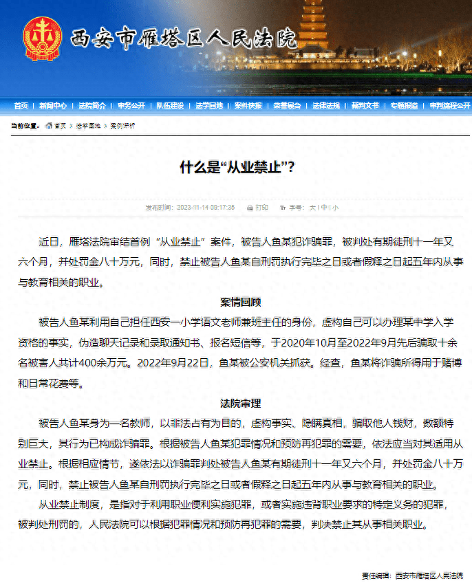 日前,据西安市雁塔区人民法院消息,近日,雁塔法院审结首例“从业禁止”案件,被告人鱼某犯诈骗罪,被判处有期徒刑十一年又六个月,并处罚金八十万元,同时,禁止被告人鱼某自刑罚执行完毕之日或者假释之日起五年内从事与教育相关的职业。