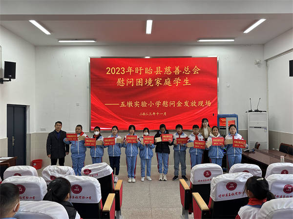 2023年11月16日盱眙县五墩实验小学在报告厅举行了“盱眙县慈善总会慰问困境家庭学生慰问金”的发放活动,39名受助学生和家长共同参加。本次发放活动,一共分为四组进行,由盱眙县五墩实验小学党委副书记柏庆友和分管学校德育工作的叶笑菁副校长一同为受助学生发放慰问金。