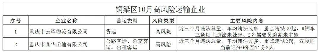 2023年10月,铜梁共计2家高风险道路运输企业被评估为高风险企业。存在的高风险隐患主要为:严重交通违法(主要是超速、超载等),企业所属重点车辆存在逾期未检验、未报废、3条以上违法未处理,重点驾驶人逾期未审验、未换证、驾驶证被记9-11分等情形。现对2家高风险运输企业进行曝光。