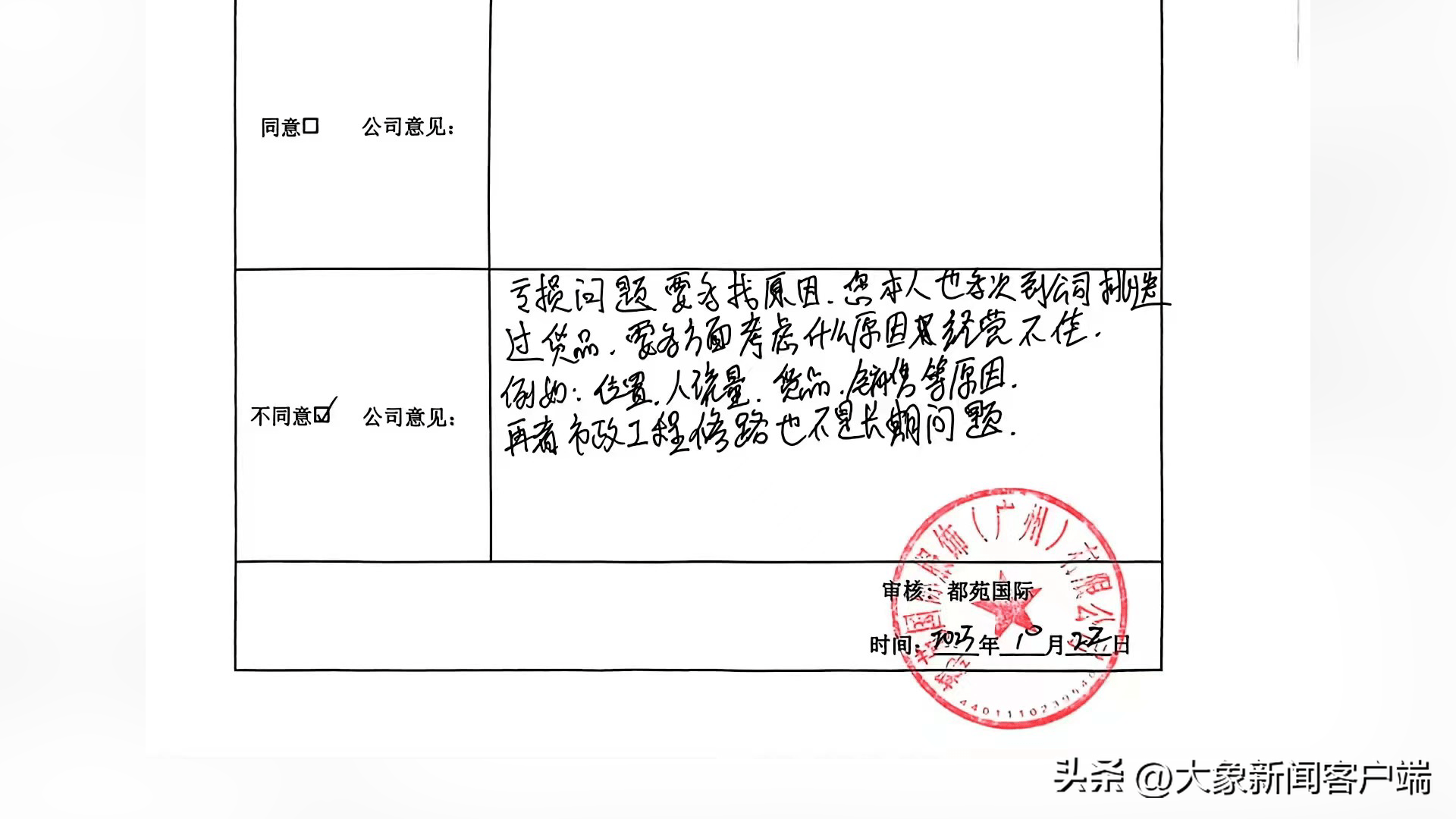 曾女士就这样坚持经营了3个多月,连最基本的房租都没有赚回来。10月9日,曾女士向都苑国际服饰公司申请撤店,10月22日,都苑国际服饰公司书面回复的意见栏里写着:“亏损的问题要自己找原因,您本人也多次到公司挑选过货品,要多方面考虑什么原因经营不佳”。