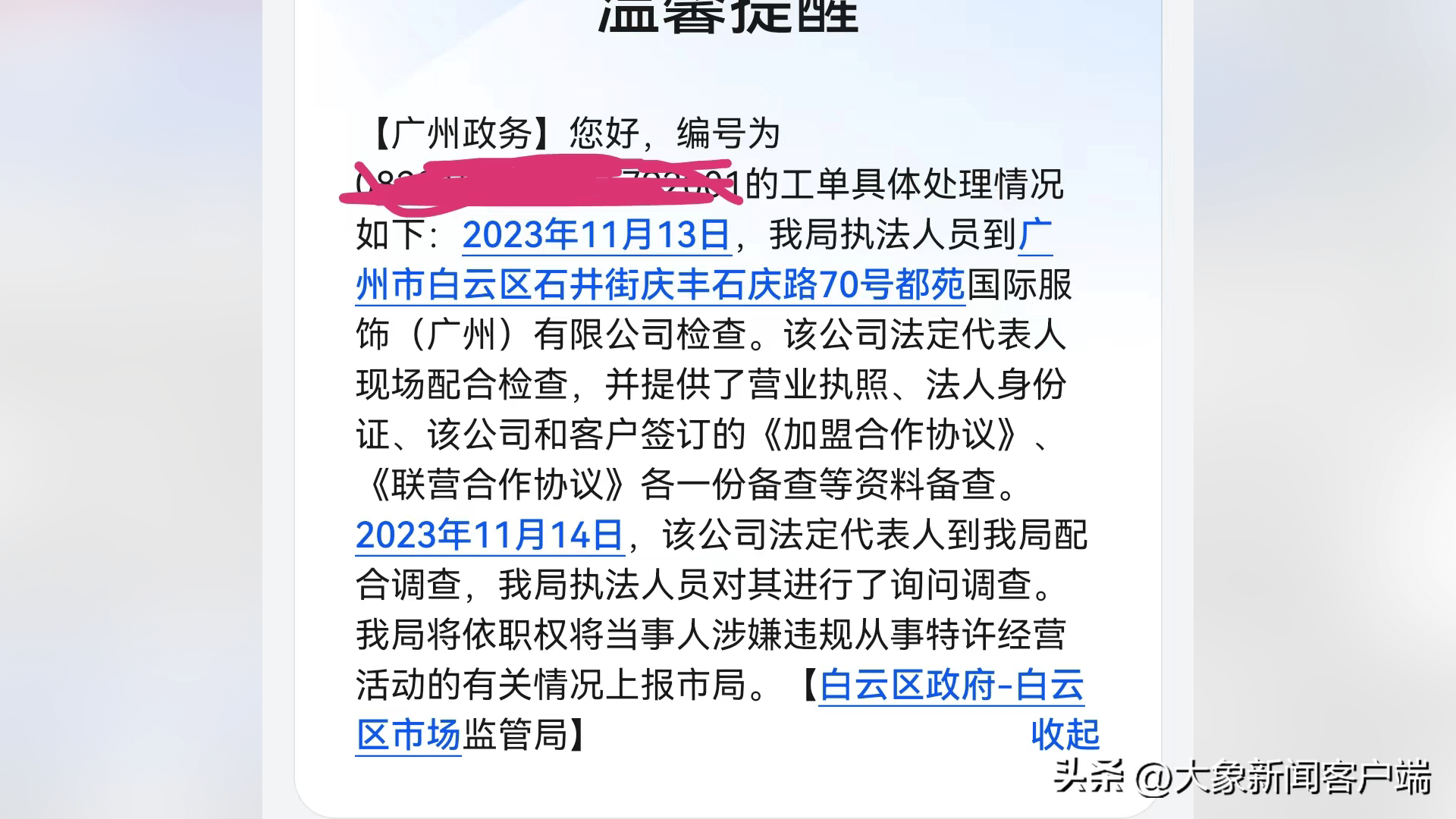 16日上午,大象新闻记者致电广州市市场监督管理局,工作人员回应称,市场监督管理部门有行政办案规范,“如果需要对商家做出行政处罚,会在一个月内协调商家,同时商家也有行政复议权,这个时候案情并不适合对媒体进行公开,他们会按照程序办事。”