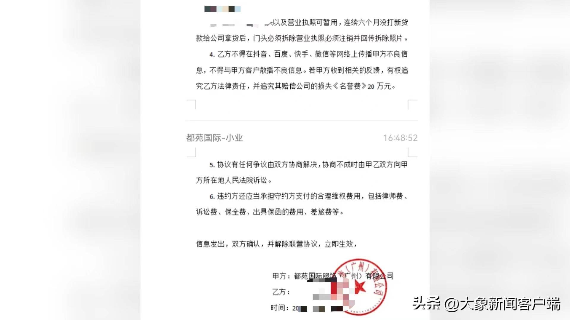 15日,广州的曾女士又向大象新闻·大象帮反映,她和马女士的遭遇相似,也与都苑国际服饰(广州)有限公司签订了联营协议。“公司说我违约,说要告我,现在要我转加盟,我每个月的铺租都要3000多元,一直在亏,我已经亏了10多万了。”由于亏损严重且无法撤店,保证金也无法退还,无奈之下,马女士只能和都苑国际服饰(广州)有限公司协商转为加盟模式。