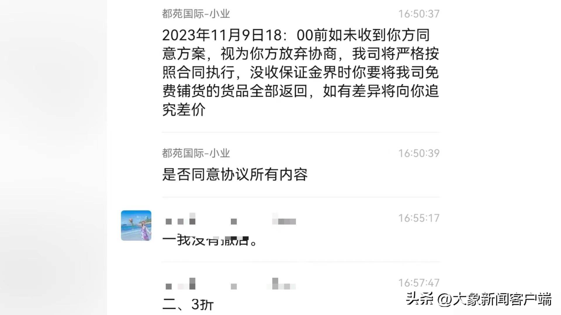 “他们公司以闭店为由逼着我转加盟,32000元保证金与系统费不退,转为加盟货款,并且货款只限于拿货。”曾女士还表示,都苑国际服饰公司要求她在11月9日6点前做出答复,如果不同意转加盟就视为放弃协商,公司将没收曾女士的保证金和系统费,还要追究她的法律责任。