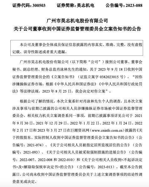 昊志机电9月19日发布的公告中称,公司接到公司董事、董事会秘书、副总经理、财务总监肖泳林的通知,其于2023年9月18日收到中国证券监督管理委员会的《立案告知书》(证监立案字0382023015号),“因你涉嫌操纵证券市场,根据《中华人民共和国证券法》《中华人民共和国行政处罚法》等法律法规,2023年8月25日,我会决定对你立案”。