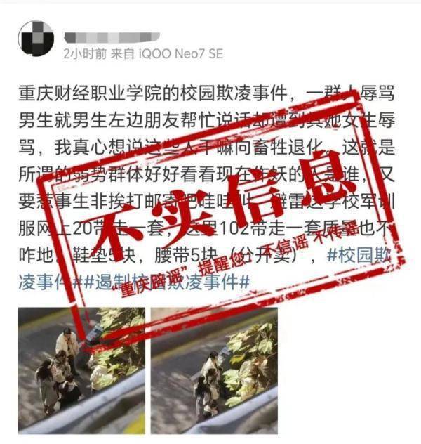 该网传信息称“重庆财经职业学院的校园欺凌事件,一群人辱骂男生,男生左边朋友帮忙说话却遭到其他女生辱骂……”经向永川区高新区管委会、重庆财经职业学院核实,该信息为不实信息,发帖人将学生间嬉戏打闹误以为争吵欺凌。目前,发帖人已主动删除相关不实帖文。