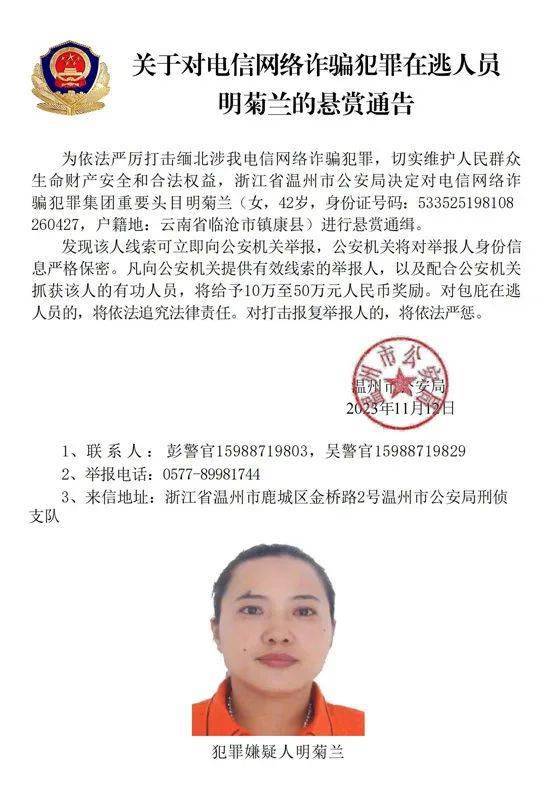 据缅甸妙瓦底电视台报道,11月16日,因实施网络诈骗、绑架、非法拘禁、敲诈勒索等犯罪活动,明学昌、明珍珍、明国平三名缅北电信诈骗犯罪集团重要头目在缅北果敢自治区被缅甸警方抓获,此前缅甸警方已对相关人员发布通缉令。