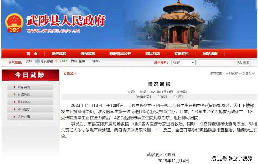据武陟县人民政府网站消息,2023年11月13日上午10时许,武陟县兴华中学初一初二部分男生在期中考试间隙如厕时,因上下楼梯发生拥挤摔倒受伤,涉及的学生第一时间送往医院接受检查治疗。目前,1名学生经全力抢救无效死亡,1名受伤较重学生正在全力救治,4名受轻微伤学生住院观察治疗、近日即可出院。