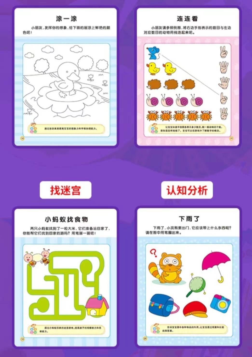 里面设置的题型多样,如孩子们喜欢的涂色游戏、走迷宫、找不同,有建立关联思维的连连看游戏,还有思维发散的认知分析等。
