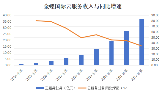金蝶国际的云服务业务收入逐年增长,从2014年的1.06亿元逐年增长至2022年的37.14亿元,但云服务业务收入增速却呈震荡下滑趋势,从2015年的80.19%下滑至2022年的34.66%。