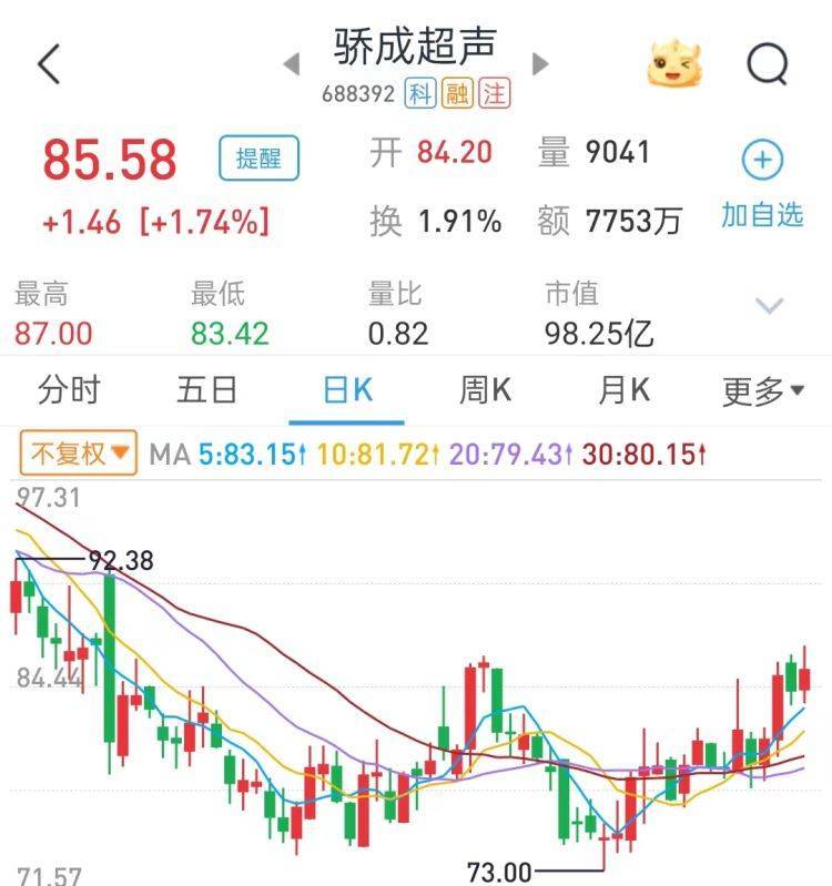 二级市场上,骄成超声16日收盘报85.58元/股,涨1.74%,公司最新总市值98.25亿元。简单计算可知道,以其16日收盘价85.58元/股计算,公司本次拟捐赠给上海交通大学教育发展基金会的30万股公司股份的市值为2567.4万元。