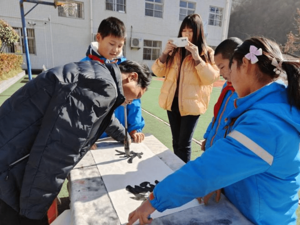柯玉金以口代手,为孩子们赠送书法作品。“希望乡村学校的孩子们能够感受到社会的温暖,增强自信、自立自强,争做建设社会的有用人才。”柯玉金说。