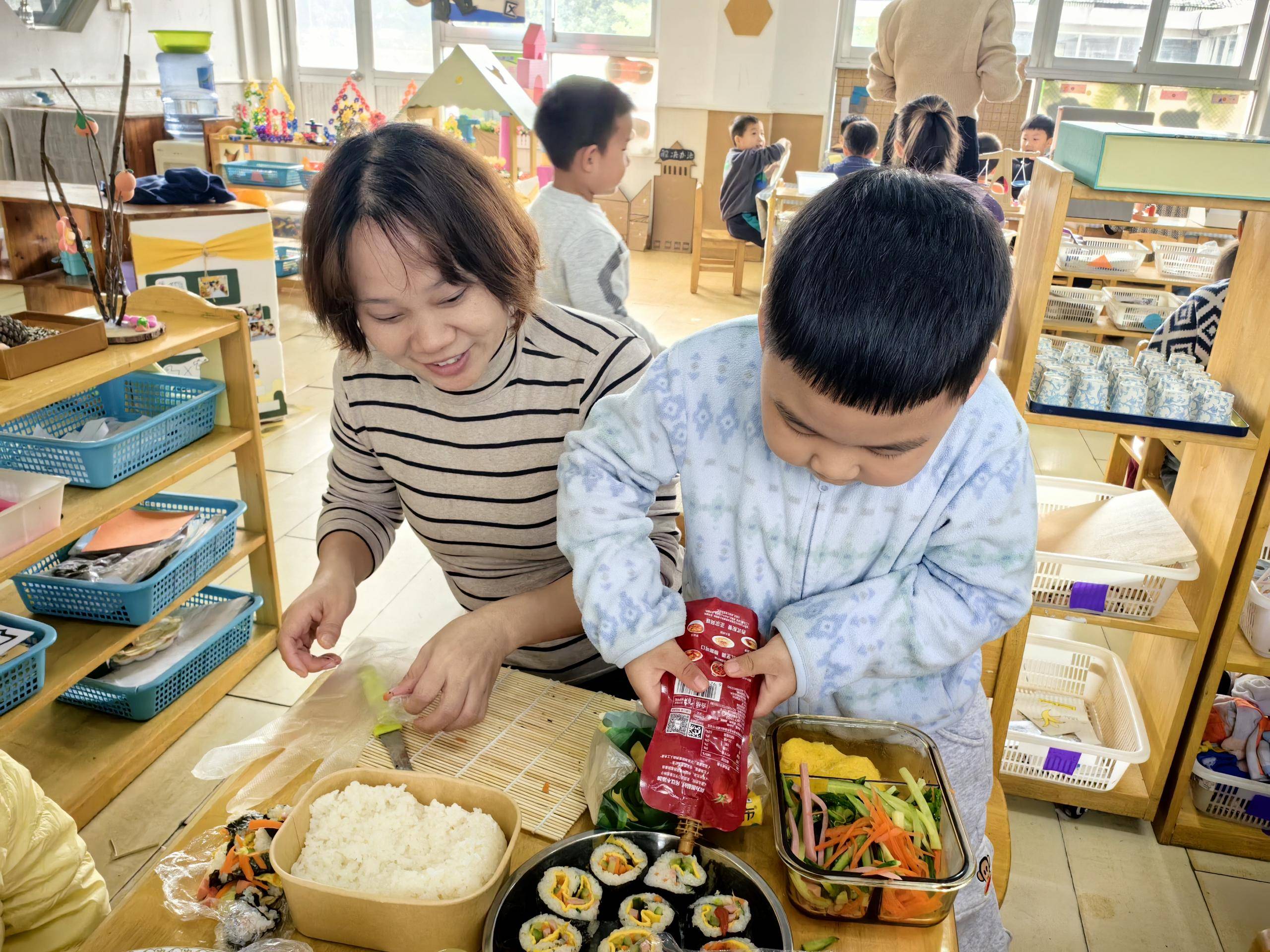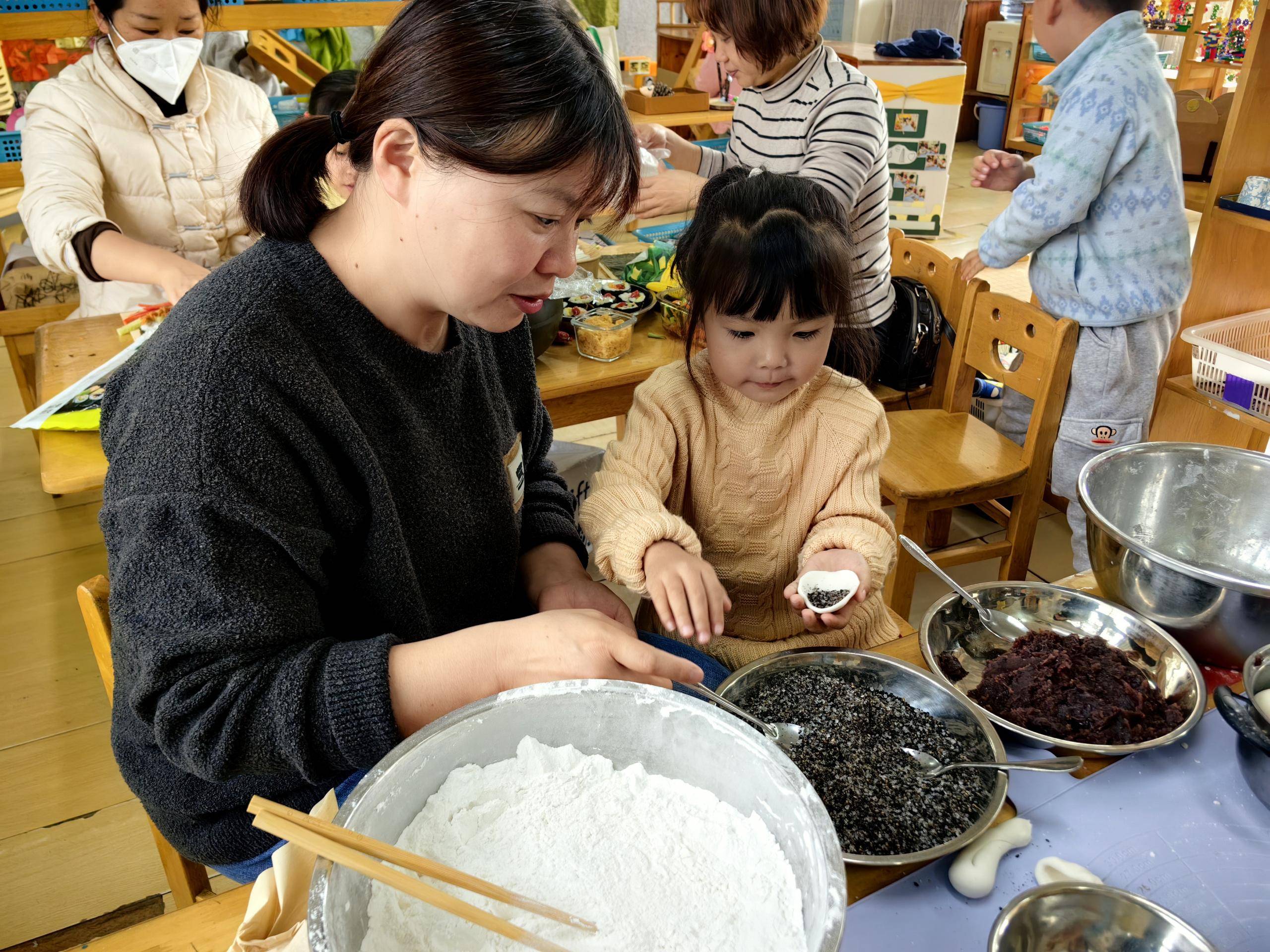 活动中,孩子们在老师的带领下,了解了“米的一生”,从整地选种到培育秧苗、插秧苗,再到除虫、施肥,最后经过收割、脱谷等步骤,一步一步成为我们常见的大米。孩子们还撸起袖子、挽起裤管切身体验了插秧的艰辛。同时,老师还和孩子们介绍了伟大的杂交水稻之父——袁隆平,孩子们对这位从未谋面爷爷充满敬佩,原来米不止是那么小小的、简简单单的食物,更是中国13亿人们的命,“爱惜粮食”之根深埋在孩子们的心中。在分组活动中,有的孩子用不同种类的米或不同颜色的米贴出各种造型,有的用米贴出了动物的造型,有的用米贴出了小花,还有的用米贴出了美丽的风景;有的孩子在妈妈的带领下,用米饭、海苔、香肠等食物,制作了寿司;还有的孩子在老师的指导下,用糯米粉、红豆沙搓出了汤圆。