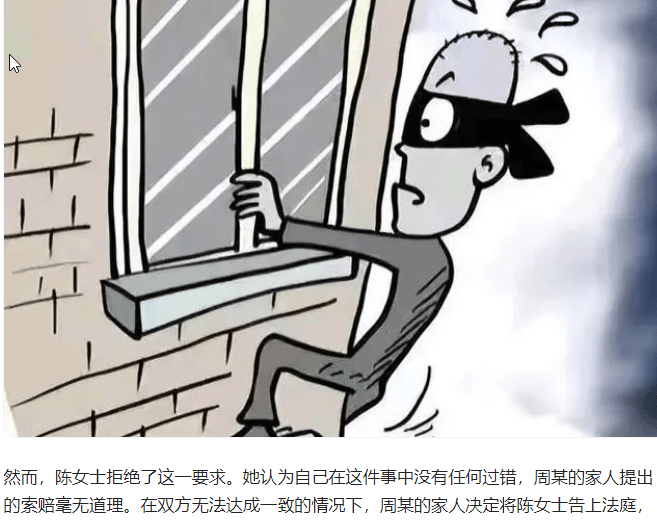 男子深夜爬独居女子窗户被击打坠亡 【男子深夜爬窗欲犯罪,遭女子拖把击中坠亡】11月15日,浙江湖州发生一起惊险的案件。据悉,男子周某得知同村女子陈女士独居后,深夜爬窗想进入陈女士家中实施不法行为,并威胁陈女士:“老实点,小心我要你小命!”陈女士用拖把击中周某,周某失去平衡坠亡。周某家属要求陈女士赔偿50万元丧葬费和抚恤金,但法院最终驳回了诉求,认定陈女士为正当防卫。