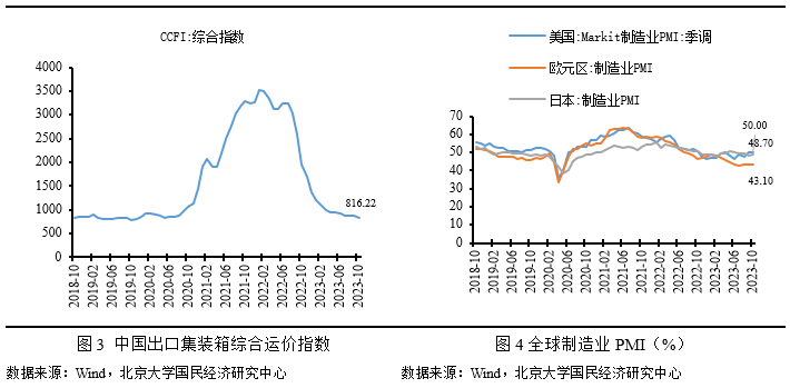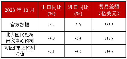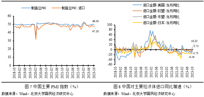 2023年10月份,中国出口总额2748.3亿美元,同比下降6.4%,较9月降幅扩张0.2个百分点,低于市场预期。海外需求弱于预期是本月出口降幅略有扩张的主要原因。10月全球地缘政治冲突多发,地区战争外溢,拉低全球经济增速。10月份,全球制造业PMI为48.8,较上月下降0.4个百分点,全球制造业有所下行。全球及主要经济体10月综合PMI,除美国较前月略有上涨外,日本、欧盟均较9月显著下滑,反映出10月全球经济相对下行,外需相对收缩。10月份,中国PMI新出口订单为46.8,较上月下降1.0个百分点,进一步佐证制造业出口需求有所下降。从我们的预测结果来看,出口增速低于我们的预期,这主要是由于低估了外部需求的收缩程度。