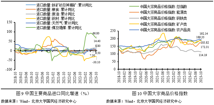 从10月的具体商品进口来看,大宗商品方面,铁矿砂及其精矿、原油、煤及褐煤、天然气、钢材的进口量累计同比增速分别为 6.5%、14.4%、66.8%、8.8%和-30.1%;除煤及褐煤、钢材外,其他大宗商品进口数量累计增速均继续上涨。农产品方面,粮食进口累计同比增速为7.3%,较上月回升1.8个百分点,肉类进口累计同比增速为3.8%,较上月下降1.8个百分点。